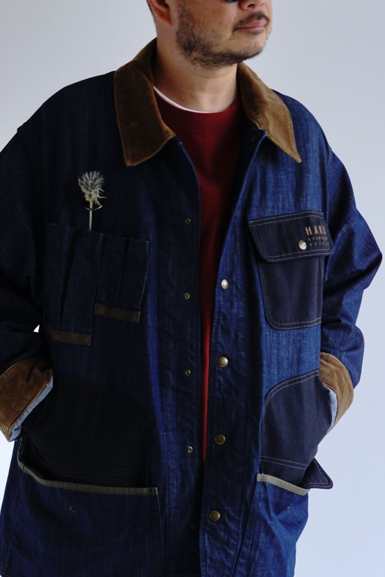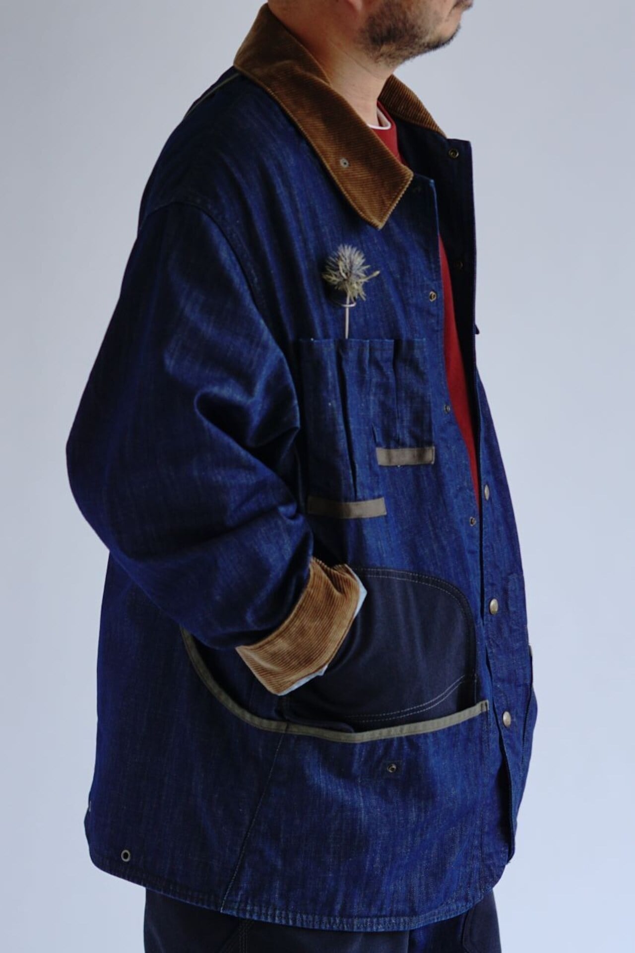 シルエットは着丈長めのゆったりとしたオーバーサイズ。肩はドロップショルダー、袖は折り返せる長めの設定で無骨なバランスを表現しています。