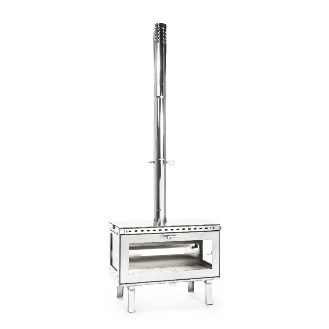 薪ストーブとして天板での調理はもちろん、天板を外すと二次燃焼構造の焚き火台としても使用でき、付属の焼き網を使えばグリル調理も楽しめる3WAYタイプ (※燃料に炭は使用できません) 。