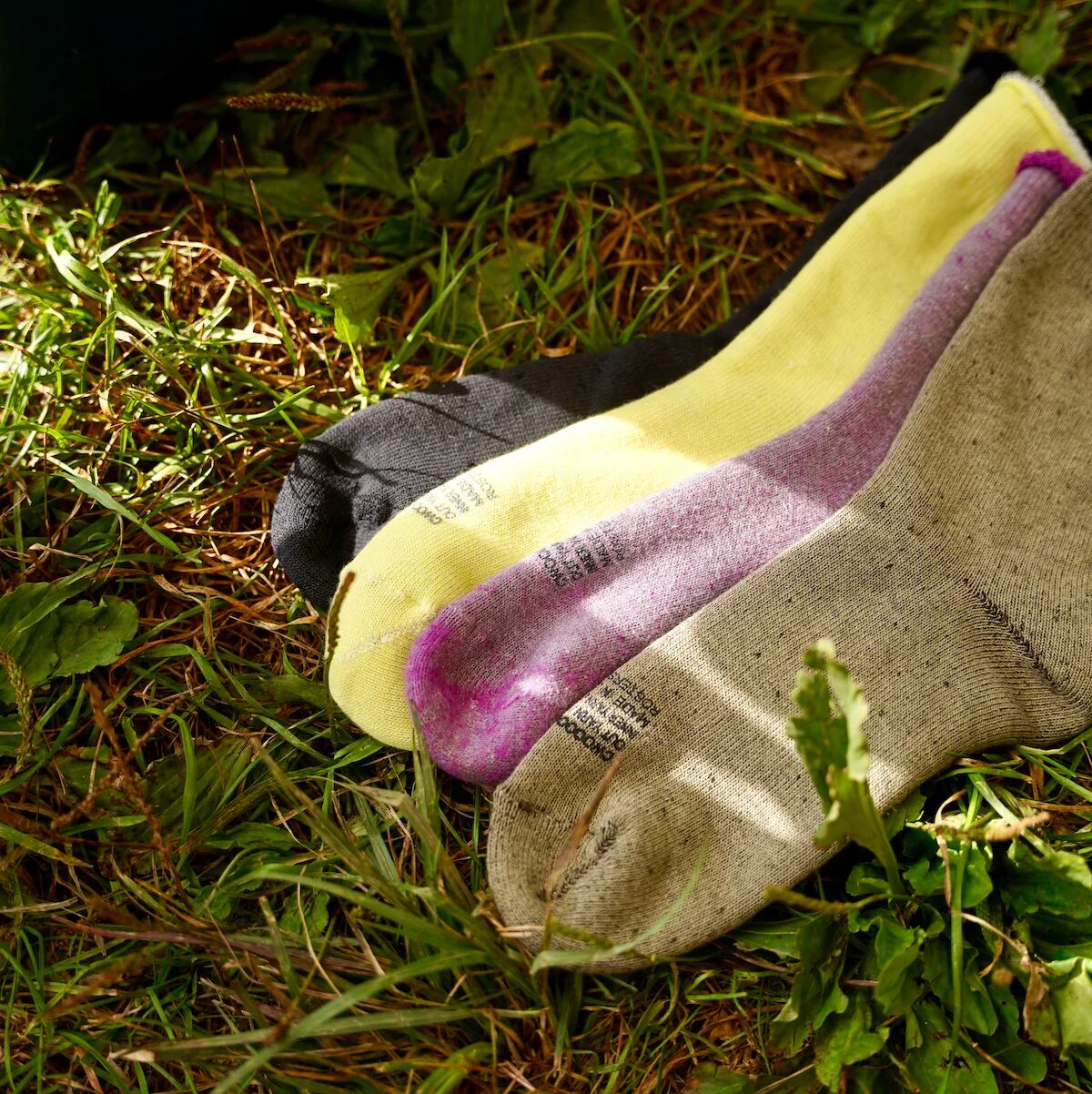 内側にメリノウールのパイル地、外側にクールマックスという両極端な素材を組み合わせた完全オリジナルな靴下