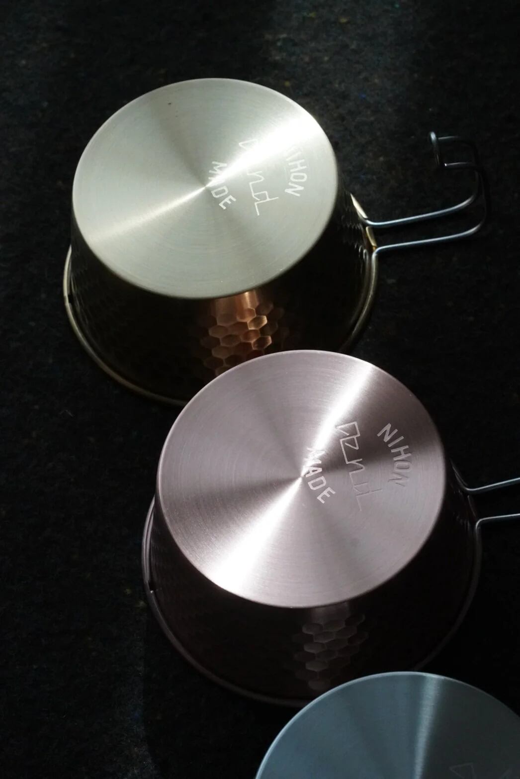 素材の中では一番色の変化を楽しめます。食べ物に触れる内側はニッケル加工をしています。新品の状態では綺麗なピンク色。開封した瞬間から指紋や空気、水に反応して経年変化が始まります。素材も柔らかいので容易に傷が付きます。あらかじめご了承ください。