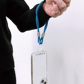 スマホアタッチメント付きです。手首にぶら下げるとちょうどよい長さです。(長さ調整はできません)共通