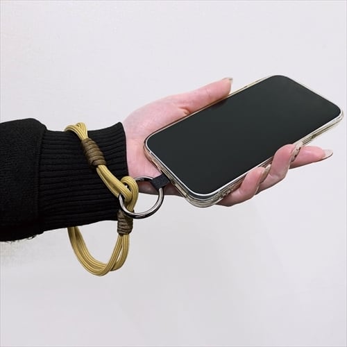 スマホアタッチメント付きです。手首にぶら下げるとちょうどよい長さです。(長さ調整はできません)共通
