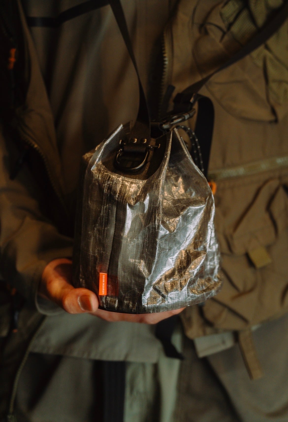 アウトドアらしいエッセンスであるワンアクションで開閉できるプラパーツを巾着部分に取り付けて、中へのアクセスを容易にしました。