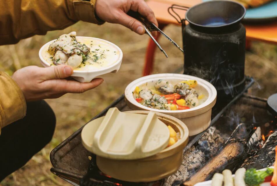 焼く、炊く、煮込む、蒸す、燻す。これ一つ持って出かければほとんどの料理に対応できる!キャンプ好きの開発メンバーの理想形、さまざまな料理に対応する陶製の土鍋型クッキングギアができました。キャンプの際の調理での使い勝手の良さを追い求めて開発しました。キャンプでお馴染みの煮込み料理はもちろん、焼き芋も切って入れるだけでホクホクの仕上がりです。焚き火にかけて細かい火加減をしなくても料理が美味しく仕上がる厚さを追求。アウトドア料理も冷めにくい高い蓄熱製と保温性。そのままテーブルに出せるサイズ感にもこだわりました。ソロキャンには1つ。ファミリーグループではお料理1種につき1つの使用がおすすめです。
